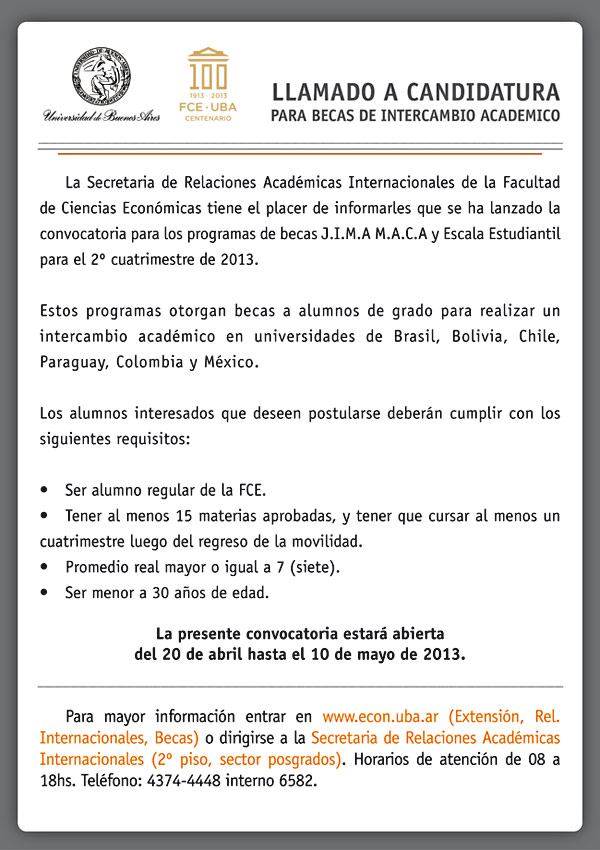 Llamado candidatura a becasLLAMADO A CANDIDATURA PARA BECAS DE INTERCAMBIO ACADÉMICO2° Cuatrimestre de 2013. La convocatoria estará abierta desde el 20 de abril hasta el 10 de mayo. 10 abril, 2013 LLAMADO A CANDIDATURA PARA BECAS DE INTERCAMBIO ACADÉMICO